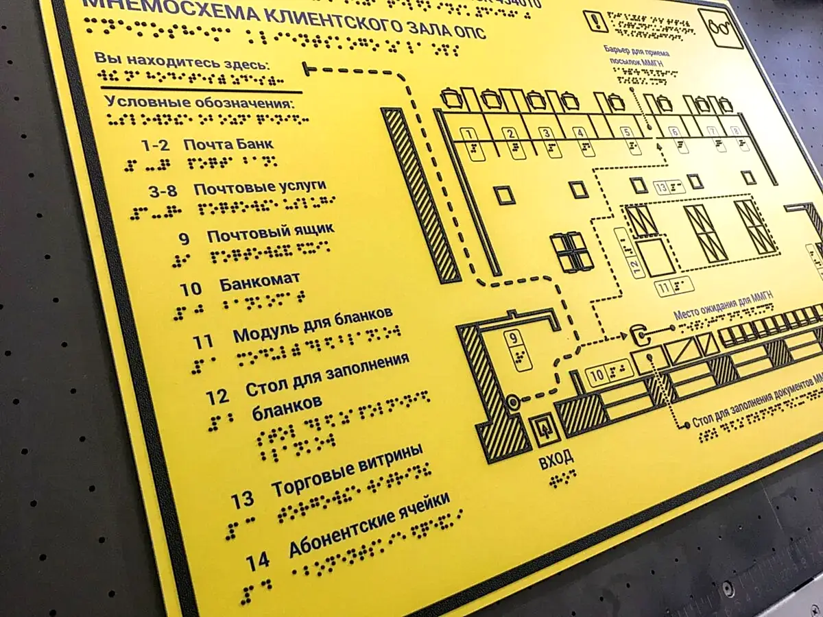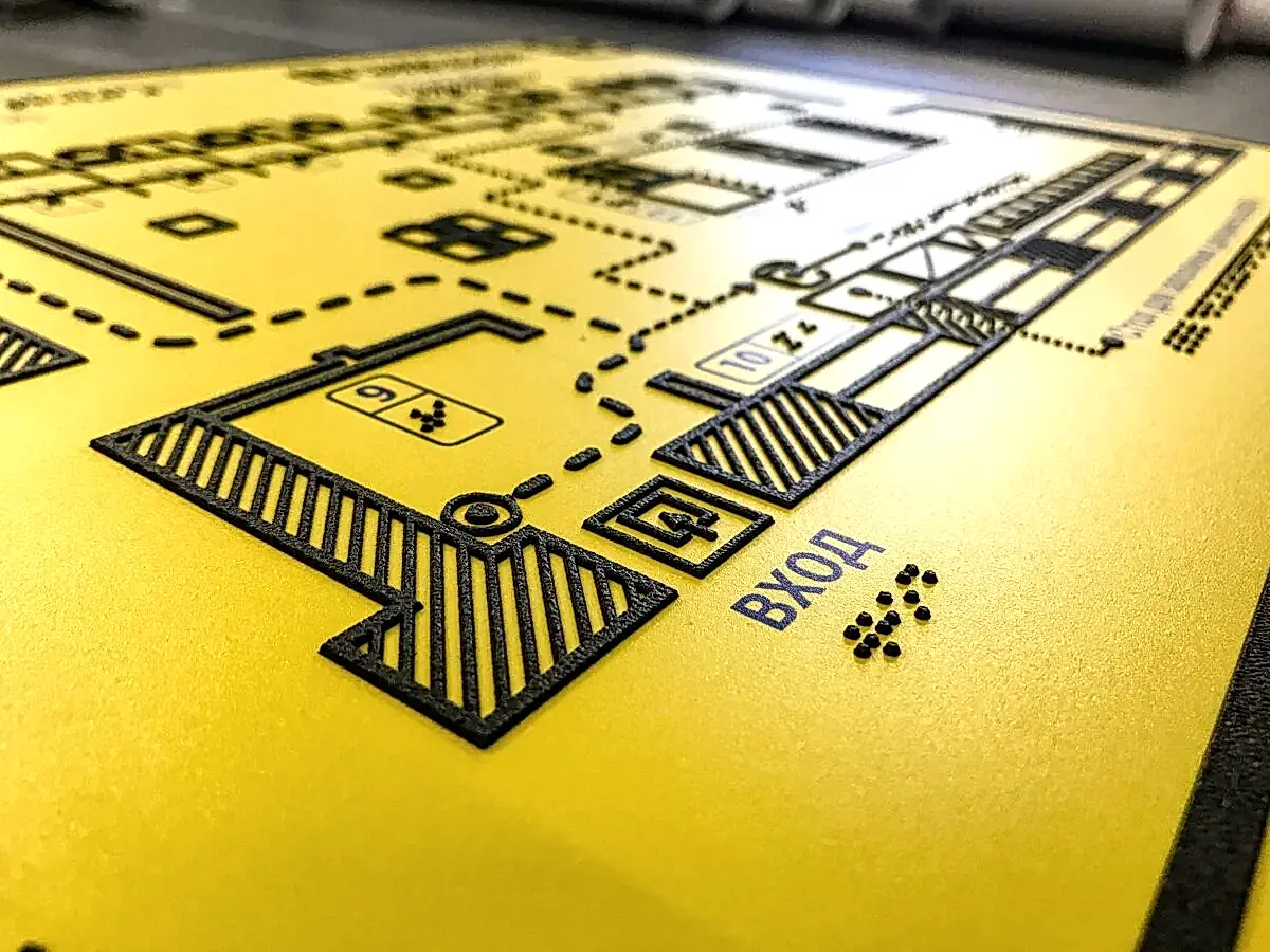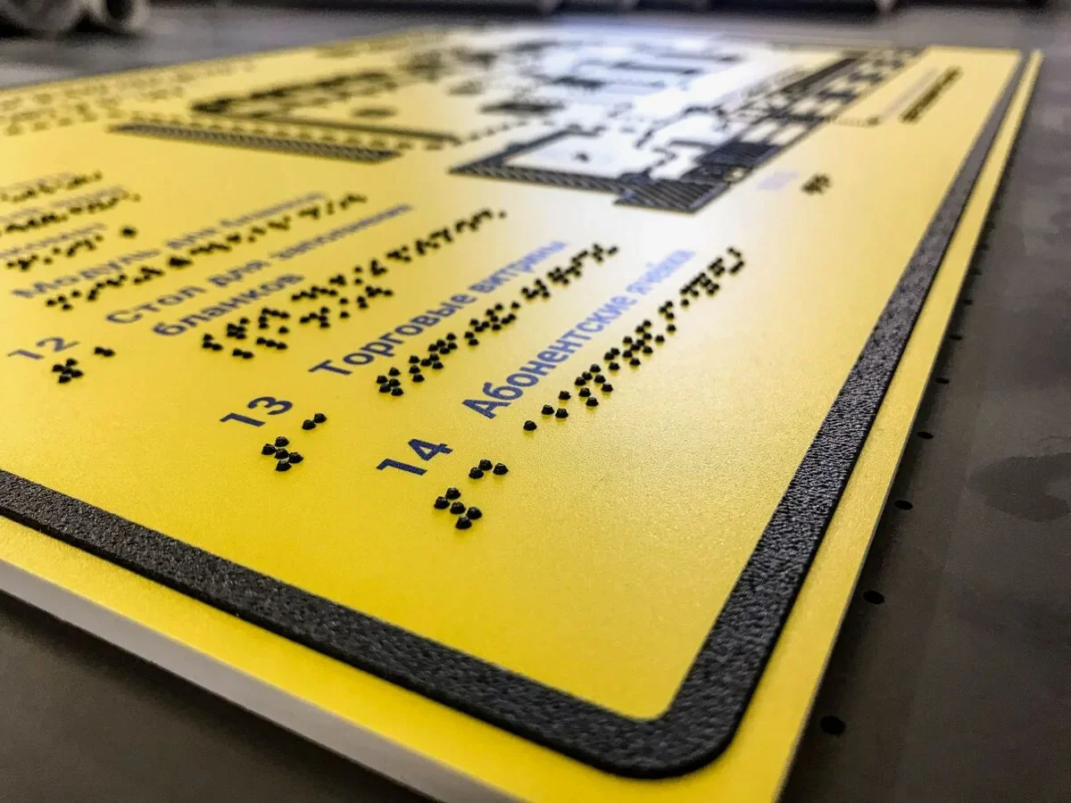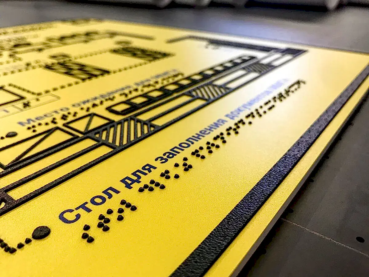 Изготовление Pin-Up табличек и вывесок с выпуклыми знаками, элементами и буквами позволяют считывать информацию с помощью прикосновений. Поскольку для слабовидящих и слепых недоступно то, что увидеть обычному человеку не составляет труда. С помощью шрифта Брайля и объемных печатных элементов люди со слабым зрением могут прочесть нужную информацию.